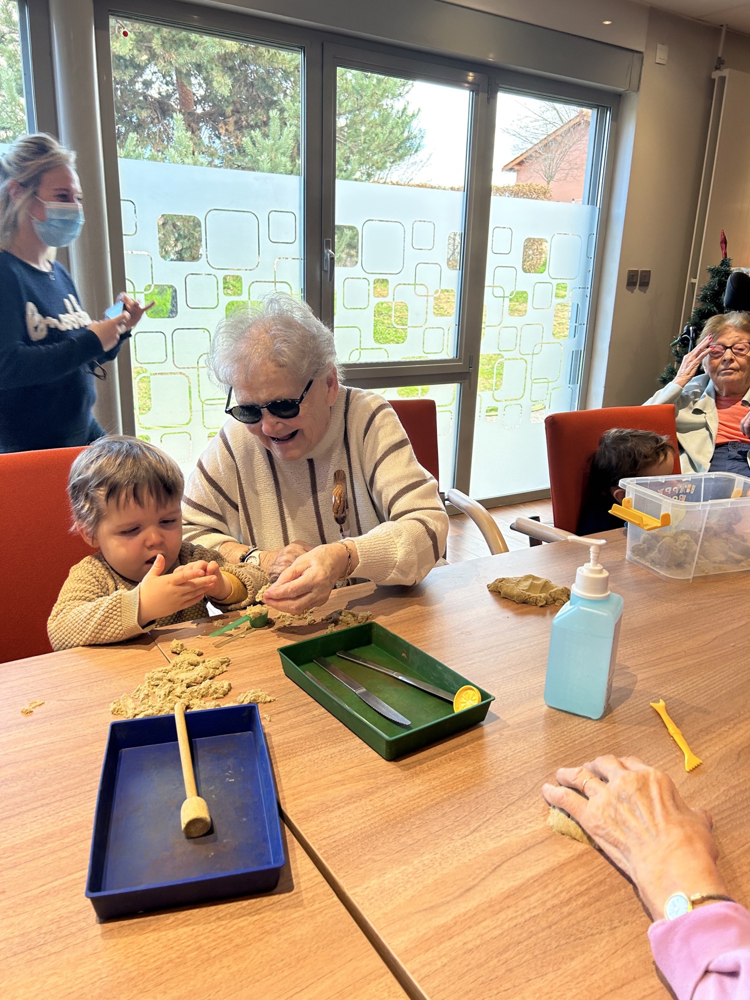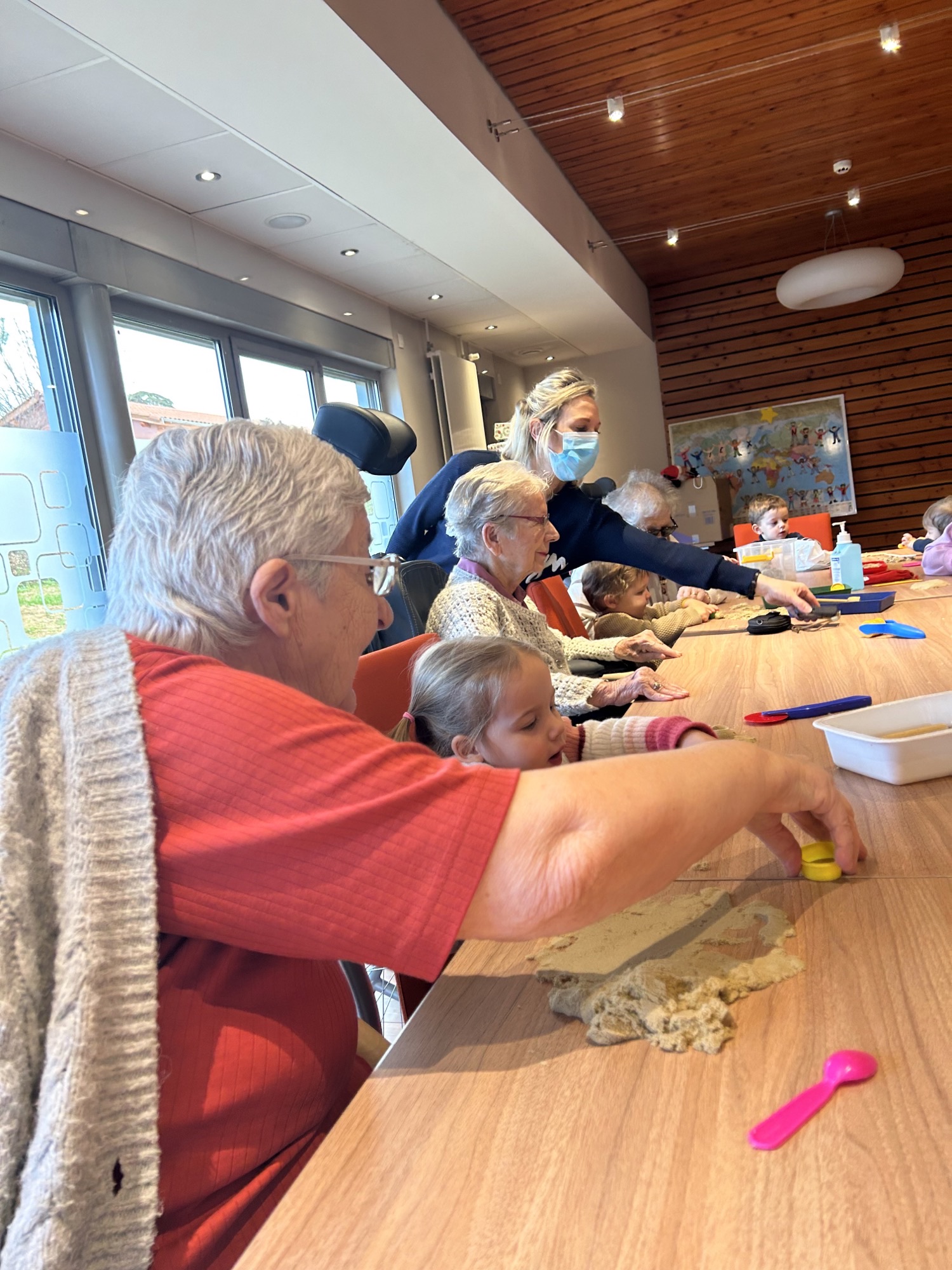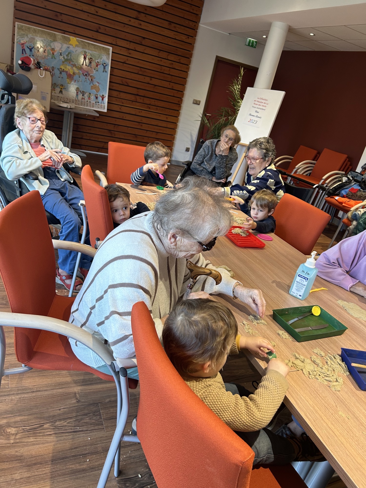 Les enfants âgés entre 2 et 3 ans sont venus partager un atelier manuel avec les Résidents. Un beau moment d’échange entre 2 générations qui s’est terminé par de jolies comptines chantées par les enfants pour les Résidents.